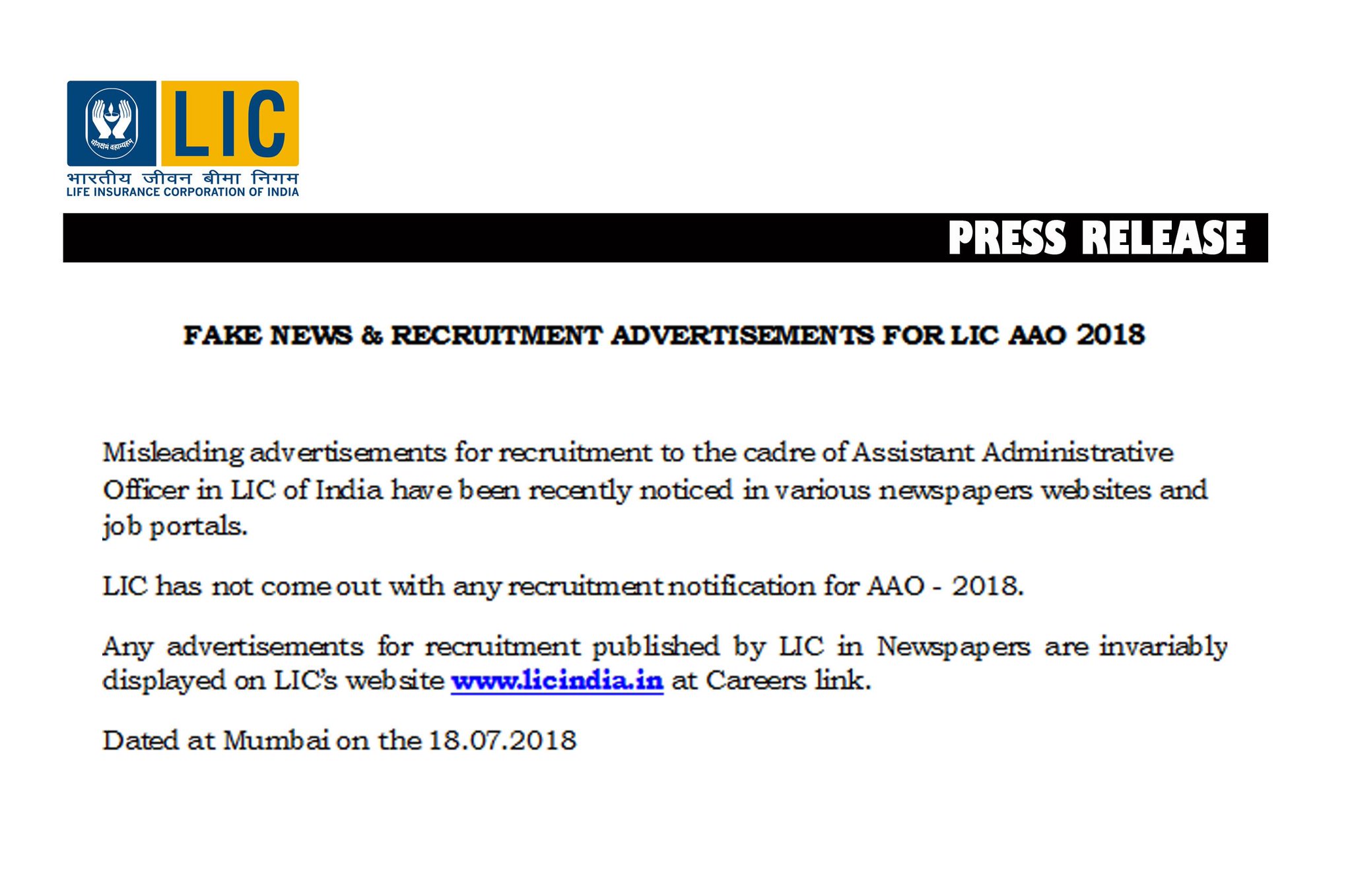 The LIC (Life Insurance Corporation) has twitted on their twitter handle about the fake recruitment notifications of LIC AAO (Assistant Administrator Officer) 2018, which are being circulated in newspapers and websites. The organization has clarified that it has not issued any recruitment notification for LIC AAO 2018 and people need to check it’s official website www.licindia.in for confirmation. Check the below notice released by LIC.